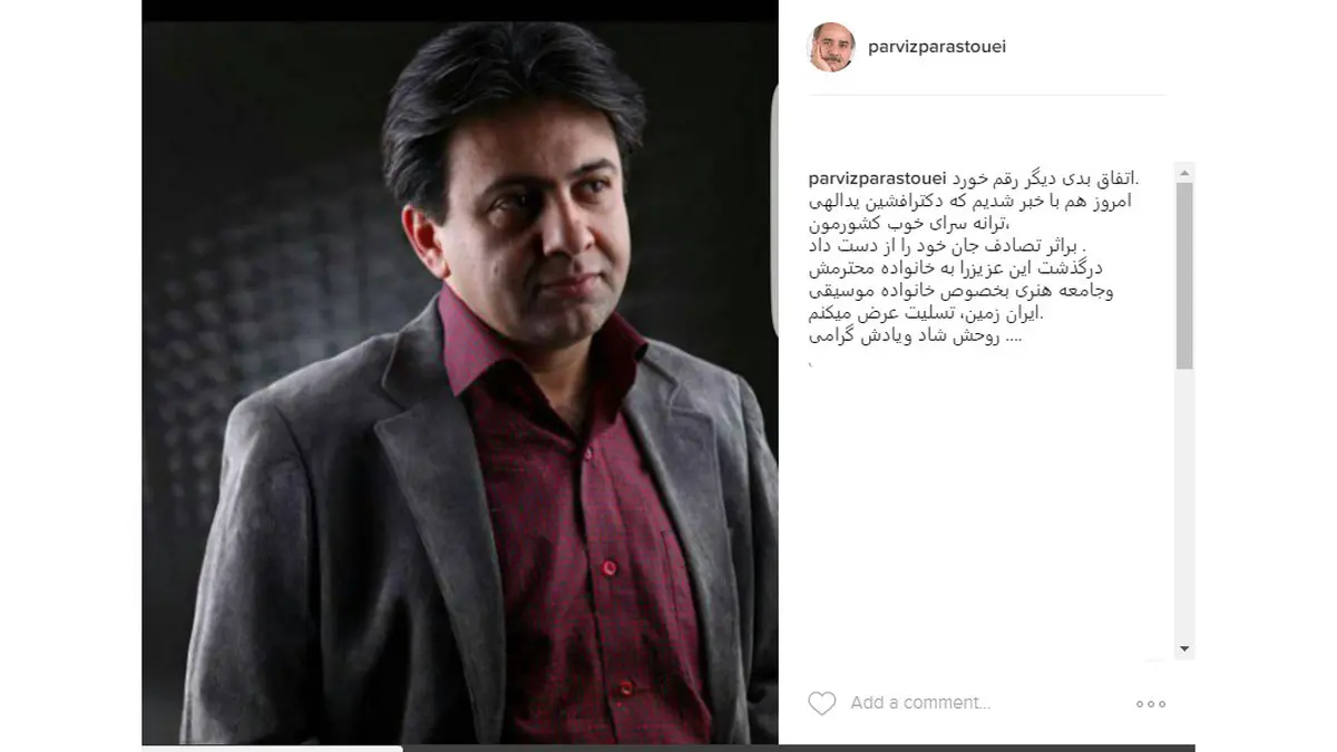 وی دراین رابطه نوشت: «اتفاق بدی دیگر رقم خورد. امروز هم با خبر شدیم که دکترافشین یدالهی ترانه سرای خوب کشورمون، براثر تصادف جان خود را از دست داد. درگذشت این عزیزرا به خانواده محترمش وجامعه هنری بخصوص خانواده موسیقی ایران زمین، تسلیت عرض میکنم.