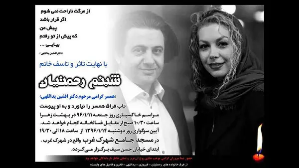 آگهی ترحیم شبنم رحمتیان، همسر زندهیاد افشین یداللهی با قسمتی از یکی از ترانههای همسرش در فضای مجازی در حال دست به دست شدن است.