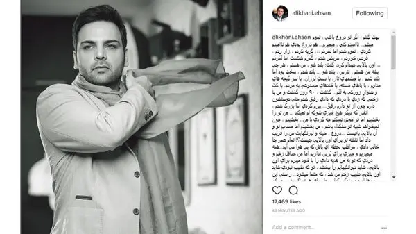 درخواست جالب و عجیب احسان علیخانی از کاربران اینترنت / لطفا داستان و افسانه نسازید +عکس