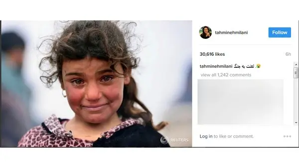 رکنا: تهمینه میلانی با انتشار عکس یک کودک سوری اعتراض خود را نسبت به جنگ نشان داد.