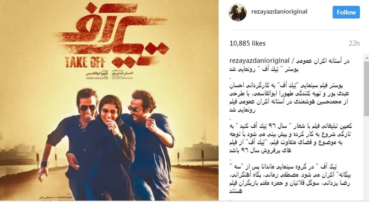 رضا یزدانی با انتشار پوستر فیلم سینمایی Movie «تِیک آف» در صفحه اینستاگرامش نوشت: «در آستانه اکران عمومى / پوستر «تِیک آف» رونمایى شد. پوستر فیلم سینمایى «تیک آف» به کارگردانى احسان عبدىپور و تهیهکنندگى طهورا ابوالقاسمى، با طرحى از محمدحسین هوشمندى در آستانه اکران عمومى فیلم رونمایى شد.»