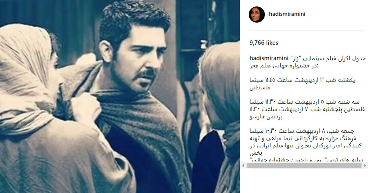 رکنا: حدیث میرامینی با انتشار پستی در صفحه اینستاگرام خود برنامه اکران فیلم «زار» در جشنواره جهانی فیلم فجر را با طرفداران خود در میان گذاشت.