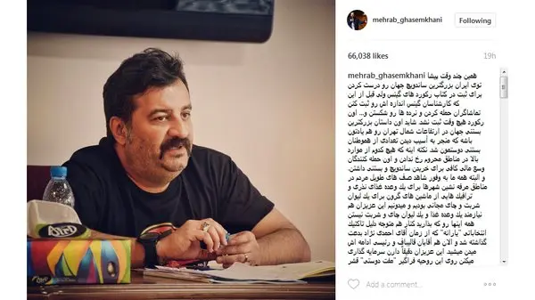 وی در توضیحات این پست نوشت: همین چند وقت پیش ها توى ایران بزرگترین ساندویچ جهان رو درست کردن براى ثبت در کتاب رکورد هاى گینس ولى قبل از این که کارشناسان گینس اندازه اش رو ثبت کنن تماشاگران حمله کردن و نرده ها رو شکستن و… اون رکورد هیچ وقت ثبت نشد. شاید اون داستان بزرگترین بستنى جهان در ارتفاعات شمال تهران رو هم یادتون باشه که منجر به آسیب دیدن تعدادى از هموطنان بستنى دوستمون شد. نکته اینه که هیچ کدوم از موارد بالا در مناطق محروم رخ ندادن و اون حمله کنندگان وسع مالى کافى براى خریدن ساندویچ و بستنى داشتن. و البته همه ما به وفور شاهد صف هاى طویل مردم در مناطق مرفه نشین شهرها براى یک وعده غذاى نذرى و ترافیک هایى از ماشین هاى گرون براى یک لیوان شربت و چاى مجانى بودیم و میدونیم این عزیزان هم نیازمند یک وعده غذا و یک لیوان چاى و شربت نیستن