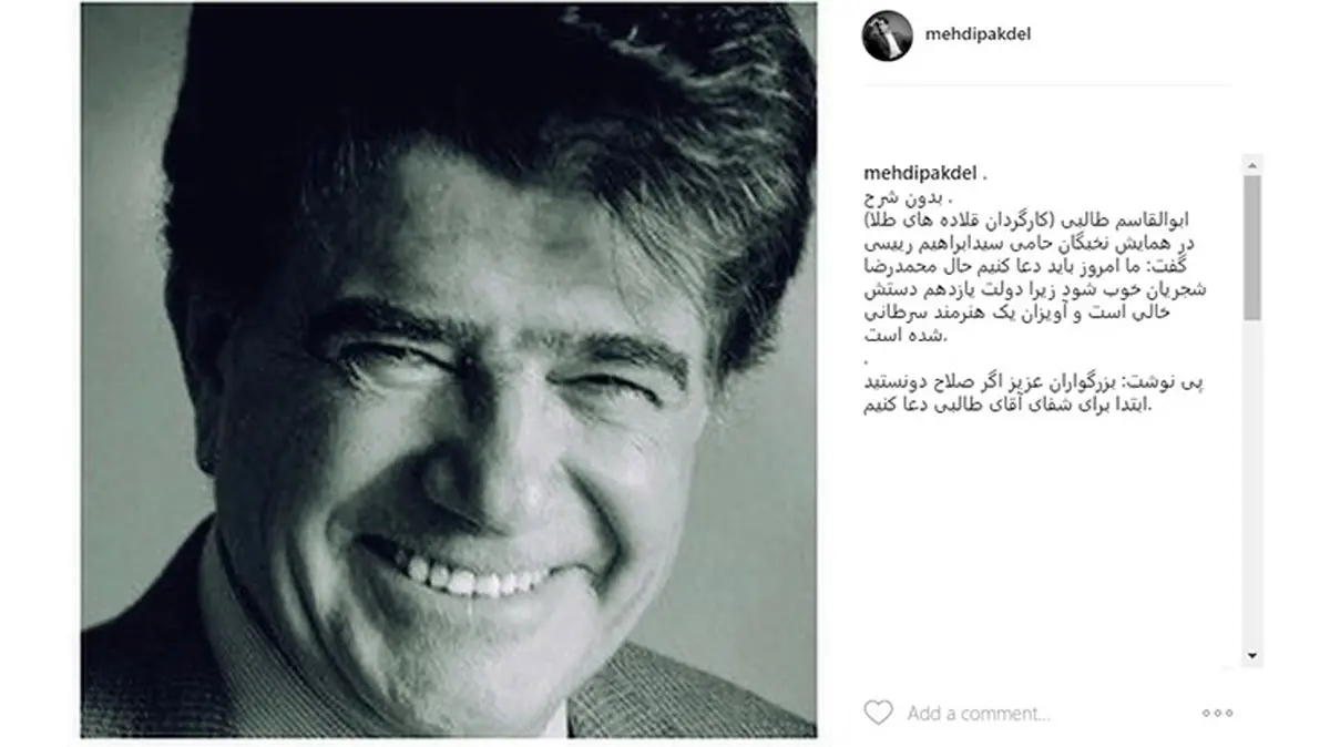 مهدی پاکدل با انتشار عکسی از محمدرضا شجریان در اینستاگرام، درباره سخنان ابوالقاسم طالبی کارگردان سینما، نوشت: «ابوالقاسم طالبی (کارگردان «قلاده هاى طلا») در همایش نخبگان حامی سیدابراهیم رییسی گفت: «ما امروز باید دعا کنیم حال محمدرضا شجریان خوب شود زیرا دولت یازدهم دستش خالی است و آویزان یک هنرمند سرطانی شده است.»