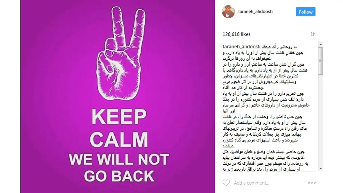 حمایت دوباره ترانه علیدوستی از حسن روحانی+ عکس