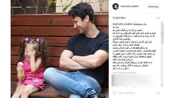رکنا: شاهرخ استخری در تازه ترین پست اینستاگرامش نوشته ای خطاب به دخترش و در حمایت از روحانی منتشر کرد.