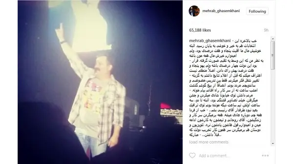 رکنا: مهراب قاسم خانی طی انتشار پستی تازه در صفحه اینستاگرامش ریاست جمهوری دوباره حسن روحانی را تبریک گفت و از مرارت های بعد از انتخاب نوشت.
