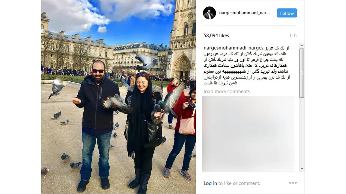 رکنا: نرگس محمدی در صفحه اینستاگرامش از کسانی که ازدواجش را تبریک گفته بودند، تشکر کرد.