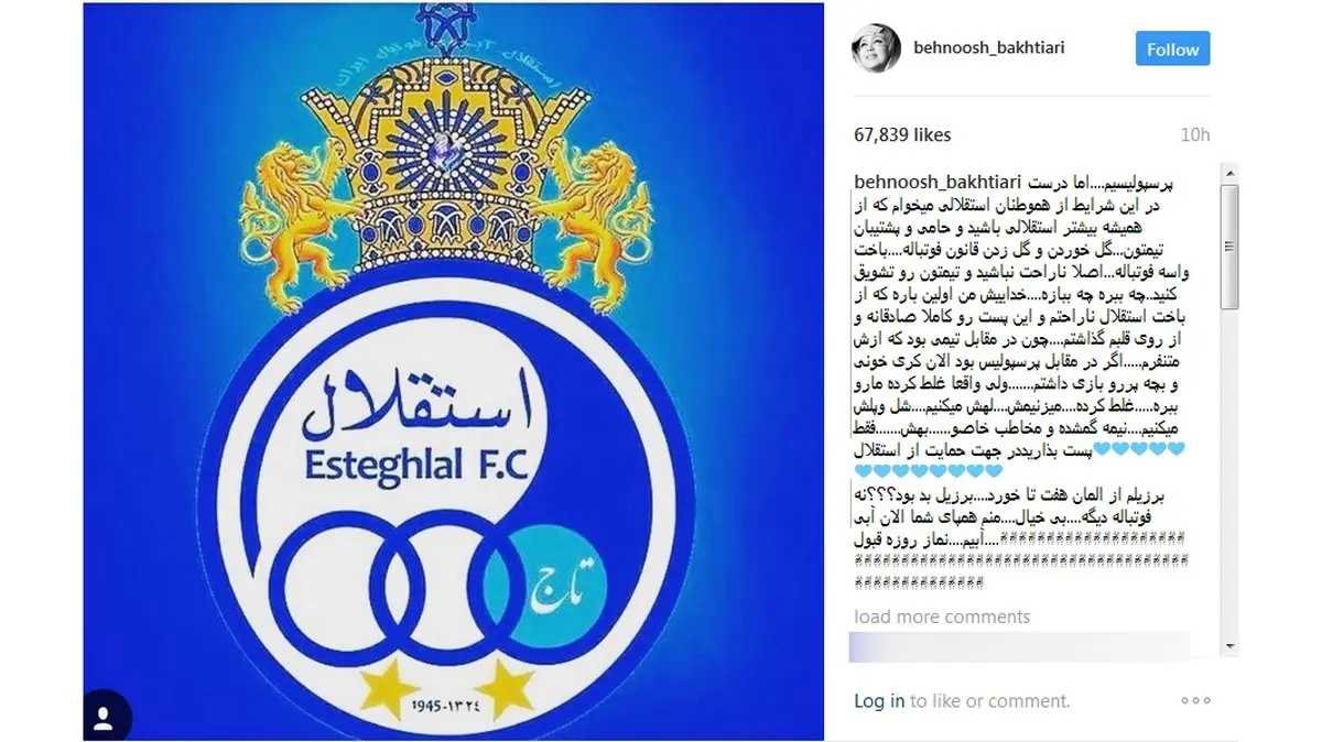 رکنا: بهنوش بختیاری بایگر پرسپولیسی سینما در حمایت از استقلال پستی در اینتاگرام شخصی خود منتشر کرد.