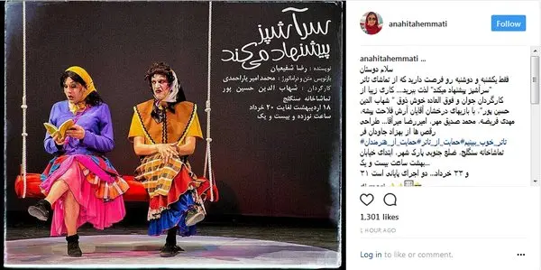 رکنا: آناهیتا همتی با انتشار پستی در اینستاگرام مردم را به دیدن نمایش سرآشپز پیشنهاد میکند به کار گردانی شهاب الدین حسین پور دعوت کرد.