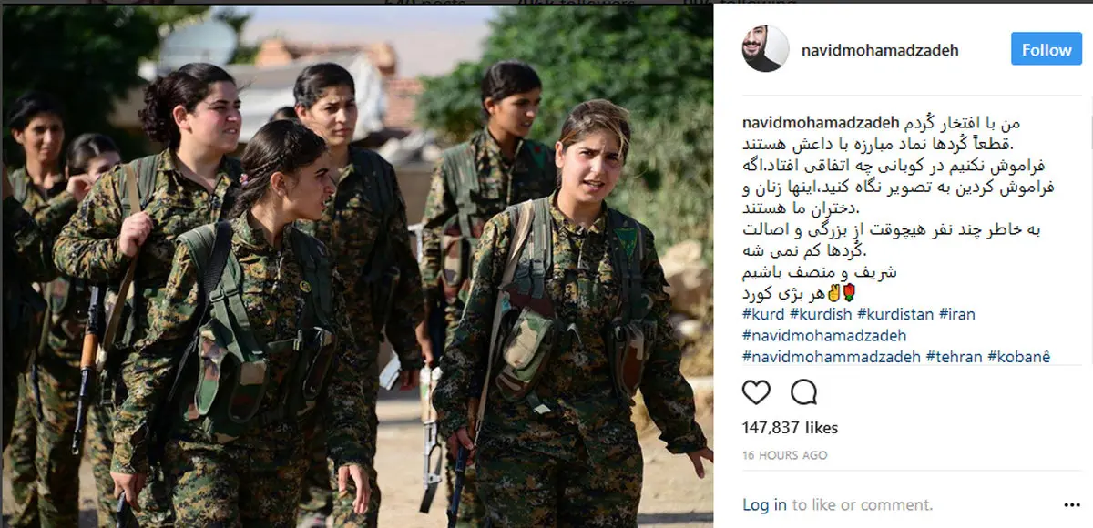 رکنا: نوید محمدزاده بازیگر سینما و تئاتر با انتشار پستی در اینستاگرام در مورد جایگاه کردها در مبارزه با داعش دیدگاه خود را بیان کرد.