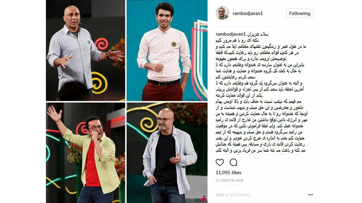 رکنا: برنامه شب گذشته ی خندوانه در قسمت «خنداننده شو» اتفاقی افتاد که باعث واکنش تند مخاطبان و کاربران فضای مجازی شد و به دنبال آن رامبد جوان به انتقادهایی که از او شده بود پستی در اینستاگرامش منتشر کرد.