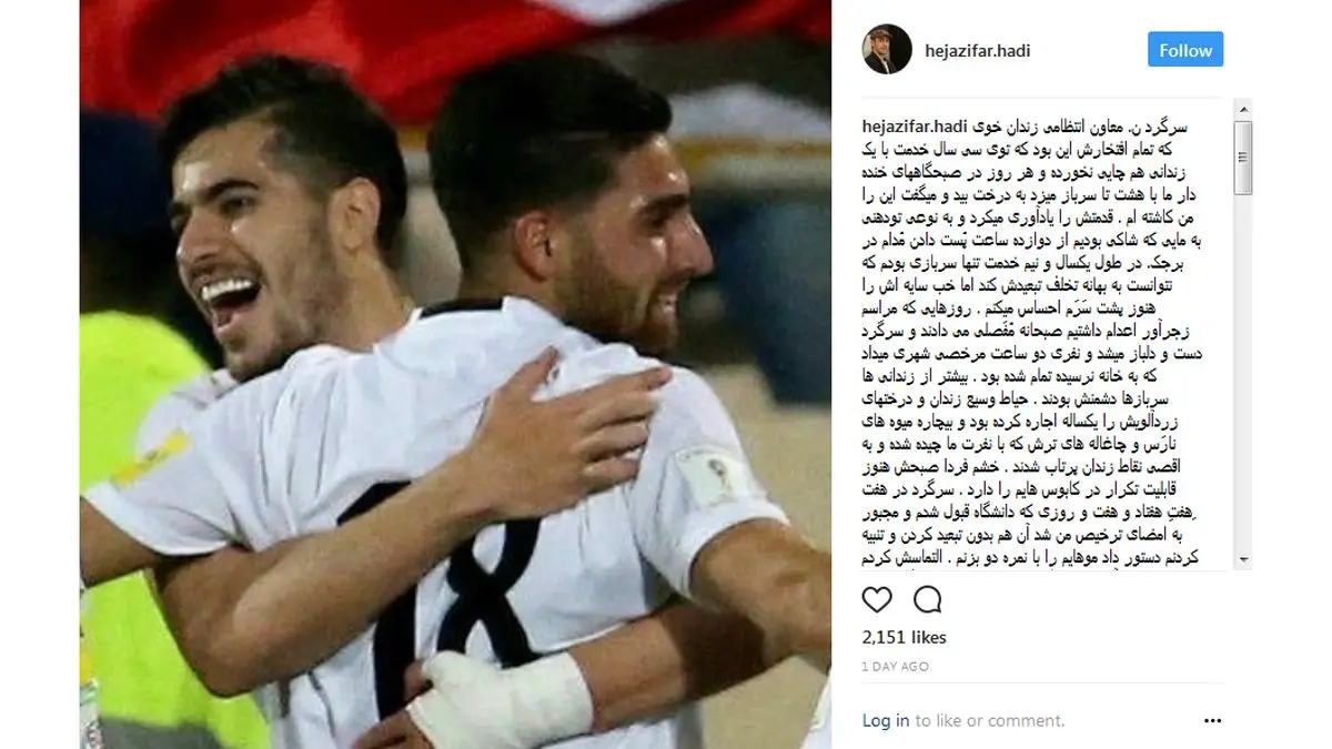 رکنا: هادی حجازیفر بازیگر Actor سینما، که با ایفای نقش حاج احمد متوسلیان در «ایستاده در غبار» بهترین فیلم سی و چهارمین جشنواره فیلم فجر به شهرت رسید، همزمان با صعود ایران به جام جهانی روسیه خاطره ای از دوران سربازی اش را در صفحه اینستاگرام Instagram خود منتشر کرد.