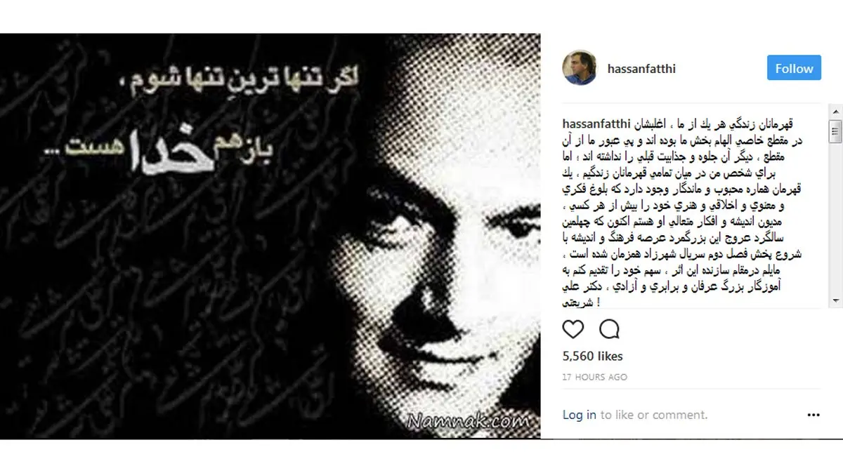 قهرمانان زندگی هر یک از ما ، اغلبشان در مقطع خاصی الهام بخش ما بوده اند و پی عبور ما از آن مقطع ، دیگر آن جلوه و جذابیت قبلی را نداشته اند ؛ اما برای شخص من در میان تمامی قهرمانان زندگیم ، یک قهرمان هماره محبوب و ماندگار وجود دارد که بلوغ فکری و معنوی و اخلاقی و هنری خود را بیش از هر کسی ، مدیون اندیشه و افکار متعالی او هستم اکنون که چهلمین سالگرد عروج این بزرگمرد عرصه فرهنگ و اندیشه با شروع پخش فصل دوم سریال شهرزاد همزمان شده است ، مایلم درمقام سازنده این اثر ، سهم خود را تقدیم کنم به آموزگار بزرگ عرفان و برابری و آزادی ، دکتر علی شریعتی ! برای ورود به کانال تلگرام ما کلیک کنید.