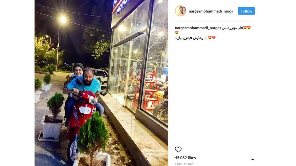 رکنا: نرگس محمدی عکسی از خودش و همسرش در پشت موتور در اینستاگرامش قرار داد.