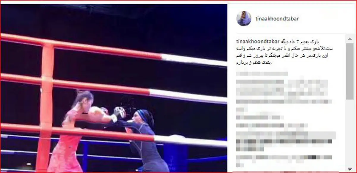 رکنا: تینا آخوندتبار با انتشار پستی از حریف و برنامه ریزی خود و قدرتش برای ادامه بازی های بوکس نوشت. وی که چند وقتی است خودش بوکس کار می کند از تجربه بازی با حرفش گفت.
