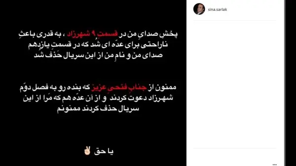 رکنا: سینا سرلک با انتشار پستی در اینستاگرام از جدایی خود از «شهرزاد» پرده برداشت.