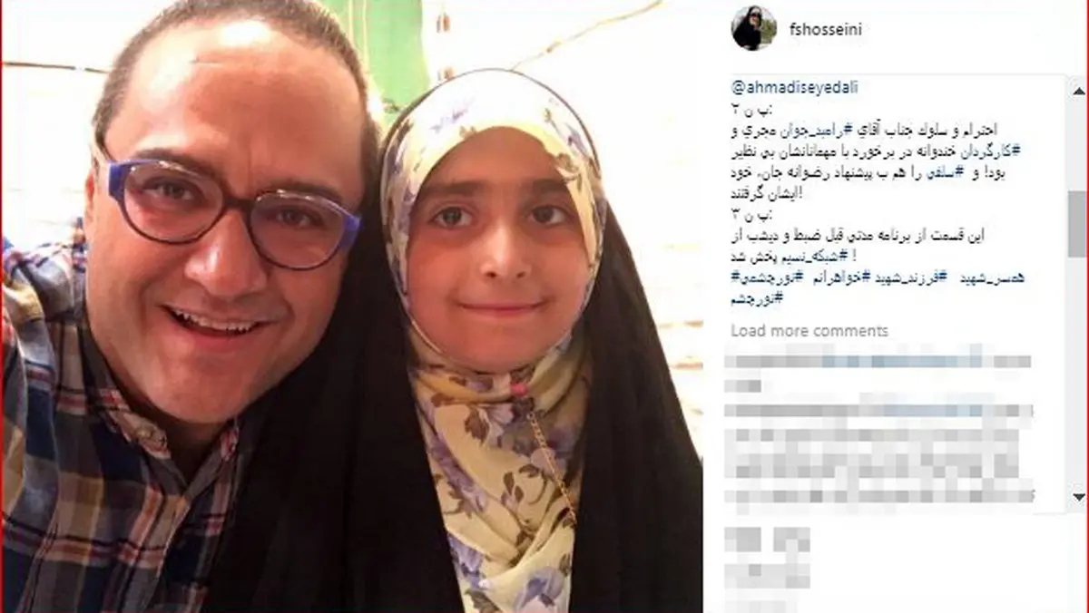 رکنا: فضه سادات حسینی مجری و گوینده خبر صدا و سیما در صفحه اینستاگرامش تصویری از دختر شهید هادی باغبانی که مهمان برنامه خندوانه بود را منتشر و از رامبد جوان مجری و تهیه کننده برنامه خندوانه به دلیل دعوت از خانواده شهدا در برنامه اش تشکر و قدردانی کرد.