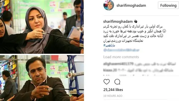 المیرا شریفی مقدم در صفحه اینستاگرام Instagram خود عکسی منتشر کرد که در آن کنار همسرش داود عابدی، مشغول تیراندازی با کمان در نمایشگاه تجهیزات ورزشی تهران دیده میشود.