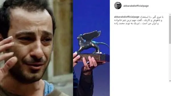 اکبر عبدی با انتشار پستی در اینستاگرام Instagram کسب جایزه بهترین بازیگر Actor مرد بخش افق های نو جشنواره ونیز را به نوید محمدزاده تبریک گفت.