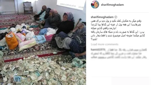 المیرا شریفی مقدم، مجری شبکه خبر، با انتشار عکسی عجیب از چند زن متکدی میانسال در صفحه شخصیاش به مردم هشدار داد. او از مردم خواست به متگدیان خیابانی کمک نکنند. در محل سکونت این متکدیان، مبالغ زیادی اسکناس انباشته شده بود که از راه تکدیگری جمعآوری شده است.