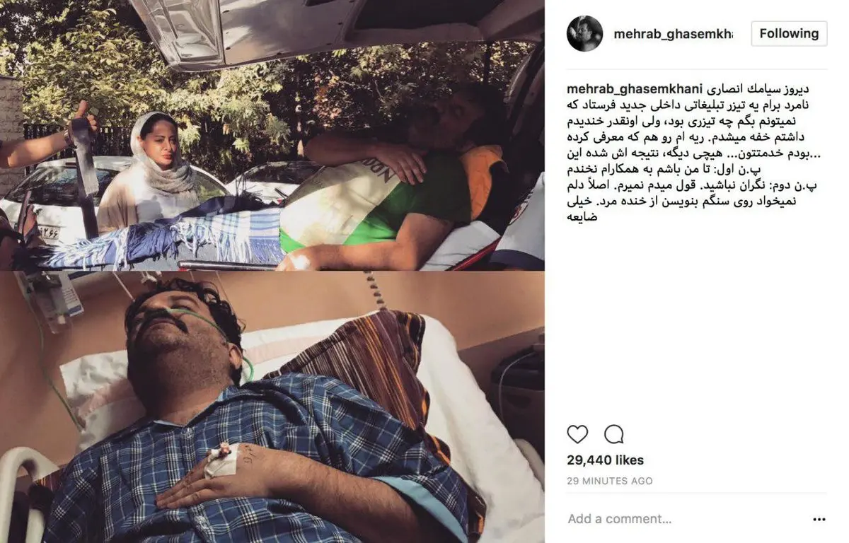 وی با انتشار این عکس نوشت: دیروز سیامک انصارى نامرد برام یه تیزر تبلیغاتى داخلى جدید فرستاد که نمیتونم بگم چه تیزرى بود، ولى اونقدر خندیدم داشتم خفه میشدم. ریه ام رو هم که معرفى کرده بودم خدمتتون... هیچى دیگه، نتیجه اش شده این...
