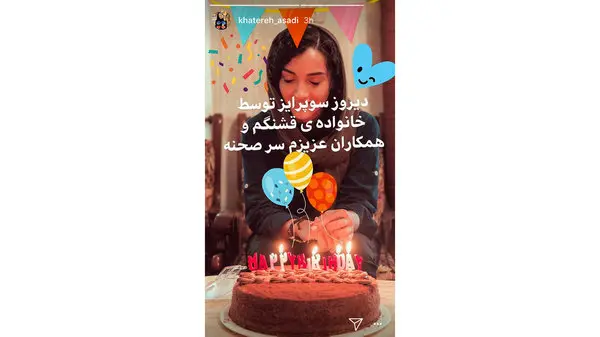 رکنا: خاطره اسدی هنگام فیلمبرداری فیلم جدیدش توسط دوستان و خانواده اش برای تولدش سورپرایز شد. وی با گذشتن این عکس در استوری اینستاگرام خود نوشت: سورپرایز توسط خانواده و همکاران عزیزم سر صحنه.