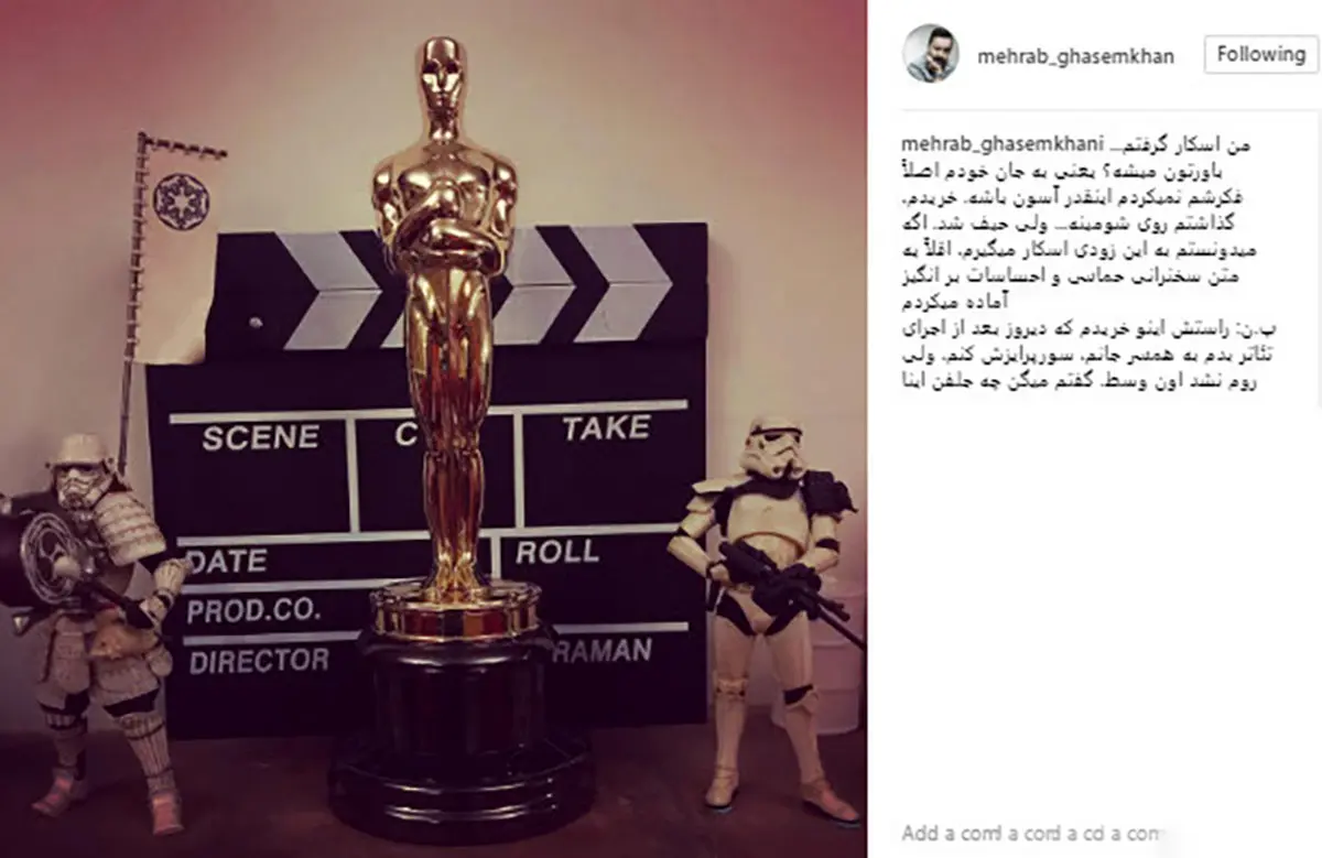 رکنا: مهراب قاسم خانی نویسنده مجموعه ها و فیلم های سینمایی همچون: باغ مظفر، مرد هزار چهره ، شب های برره، نقطه چین و پاورچین در صفحه اینستاگرامش تصویری از تندیس اسکار منتشر و عنوان کرد که هدیه ای برای همسرش بوده و از خجالت نتوانسته آن را به همسرش تقدیم کند.