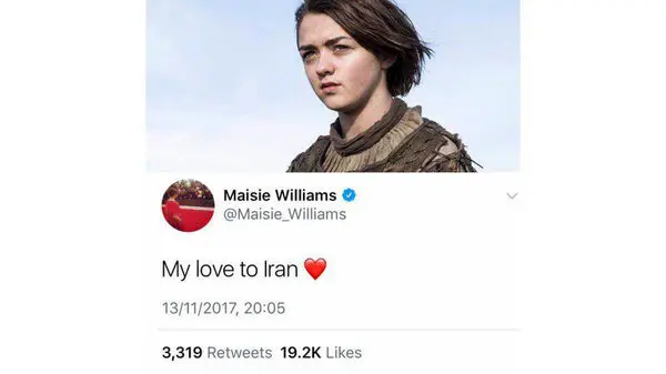 «میسی ویلیامز» که در سریال شبکه «HBO» در نقش «آریا استارک» ایفای نقش میکند، در صفحه توئیترش با نوشتن جمله “My Love To Iran”، نسبت به زلزله اخیر در غرب ایران واکنش نشان داد.