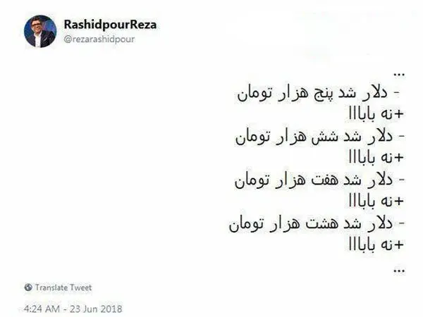 رکنا: رضا رشیدپور در توئیتر خود این توئیت را منتشر کرد و از گرانی دلار نوشت.