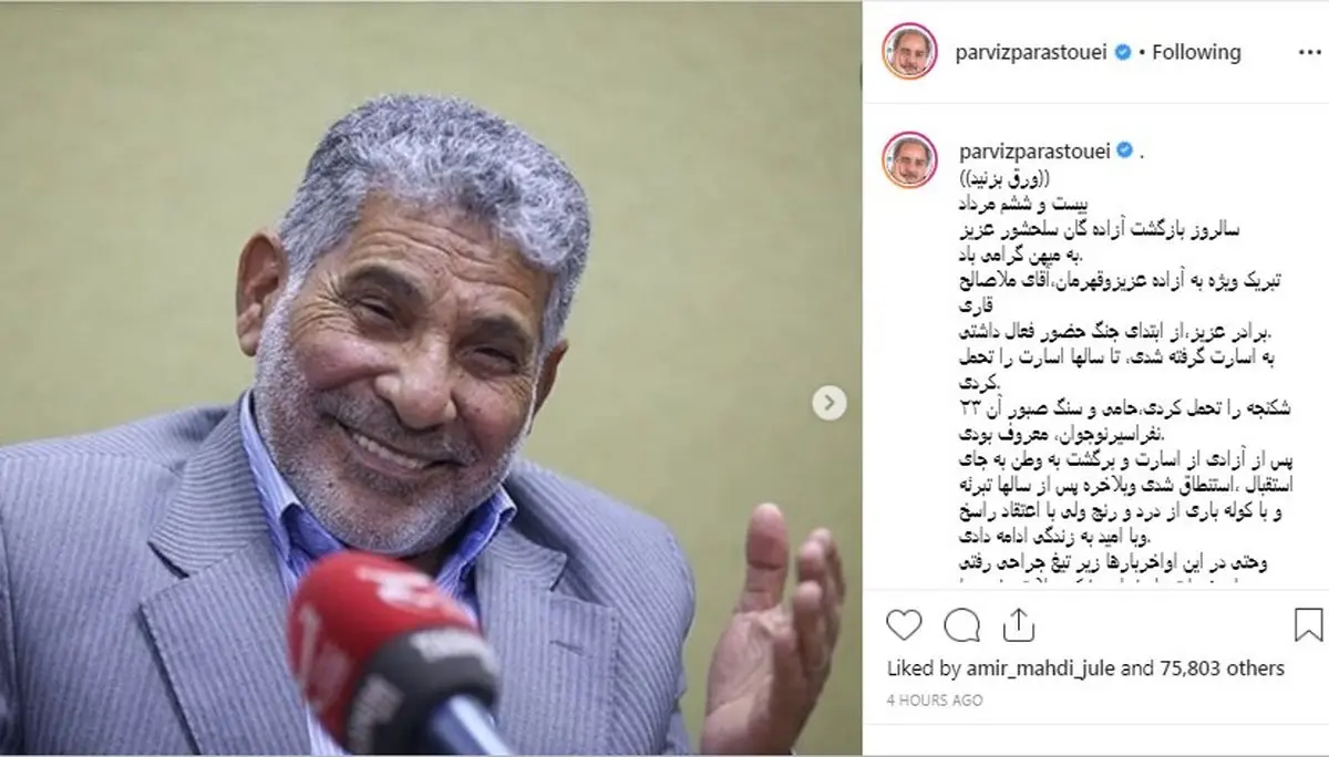 رکنا : پرویز پرستویی در پست اینستاگرام خود آزادی ملاصالح قاری را تبریک گفت.