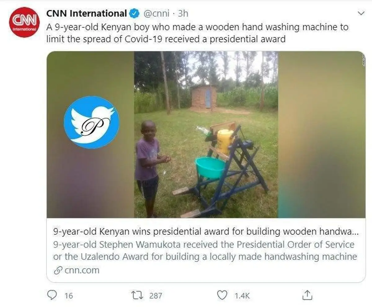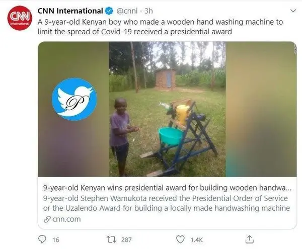 به گزارش رکنا ، پسر 9 ساله کنیایی که ماشین دست شویی خود را در عصر کرونا اختراع کرد، مفتخر به دریافت جایزه ویژه ریاست جمهوری شد.