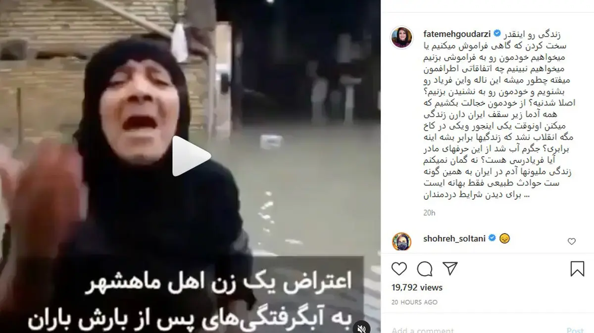 رکنا: بازیگر زن ایرانی در اینستاگرام خود در پی اننشار فیلمی از پیرزنی که سیل خانه و زندگیاش را از بین برده بود به مسئولان واکنش تندی نشان داد.