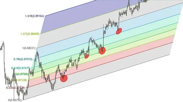 نحوه استفاده: برای استفاده از فیبوناچی فن، ابتدا یک حرکت قیمت مشخص شناسایی میشود و از آن نقطه خطوط شعاعی رسم میشود که به سطوح مختلف فیبوناچی میرسند. این خطوط میتوانند به عنوان سطوح حمایت و مقاومت در طول زمان عمل کنند.