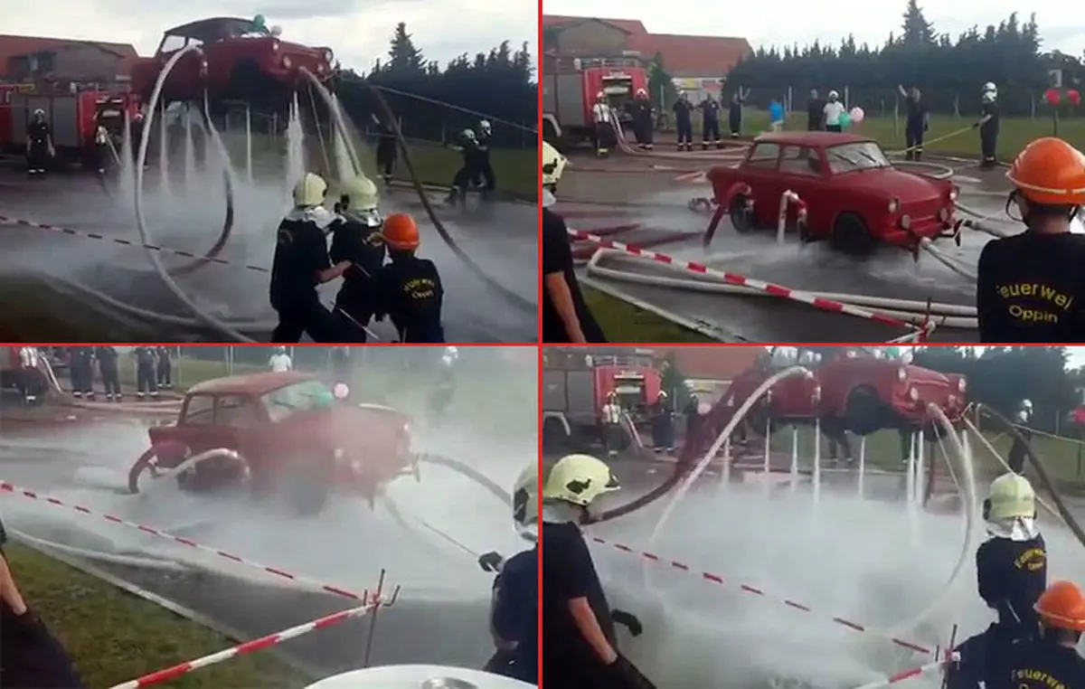 آتش نشانان ایستگاهی واقع در آلمان شرقی با استفاده از فشار آب ماشین ترابانتی را به هوا بلند کردند. در ویدئوی منتشر شده، نشان داده شده آتش نشانان هنرمند چگونه مبتکرانه با استفاده از فشار آب خودرو را به پرواز در می آورند. خودرو نخست از یک طرف از زمین کنده می شود سپس کل ماشین از زمین جدا و در آسمان معلق می ماند. شلنگ هایی به خودرو متصل شده که بعد از ورود جریان آب داخل آنها بر اثر فشار خودرو از زمین کنده می شود. در سال 1957 نخستین خودرو «ترابانت» با بدنه ای از جنس پلاستیک به بازار آمد. اولین خودرویی که در واقع آخرین خودرو این شرکت هم به حساب میآید، چرا که به مدت 34 سال بدون وقفه همان یک خودرو را تولید کردند. تنها دوبار یکی در سالهای میانی دهه 60 میلادی و یک بار بعد از فروریختن دیوار برلین تغییراتی در تزئینات داخلی و طراحی بدنه این خودرو پدید آوردند. بخش فنی و موتوری این خودرو در طول این 34 سال تنها یک بار تغییر کرد.