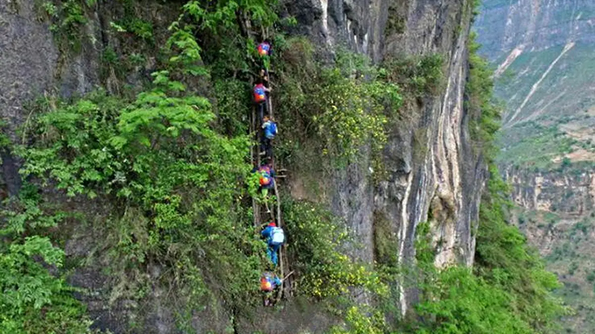 رکنا: در کوهستانهای سیچوآن چین گروهی از کودکان برای اینکه به مدرسه بروند باید از صخرهای ۸۰۰ متری پایین بیایند شرایط عبور و مرور این دانش آموزان باعث تعجب کاربران شده است.