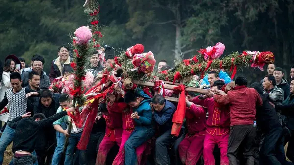 روستائیان در مراسمی عجیب سنگ صد ساله را با آب شسته و با پیچیدن یک پارچه به دورش آن را بر تخت روان چوبی قرار می دهند و چهار مرد که ظرف مدت 3 روز رژیم غذایی گیاهی داشته اند این تخت روان را در نزدیکی رودخانه حمل می کنند .