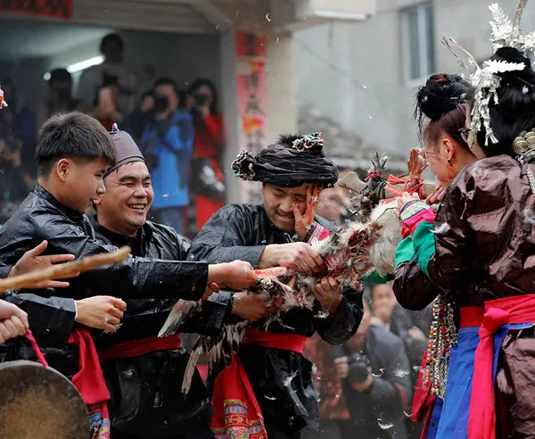 رکنا: مردان چینی در مراسمی عجیب با کندن سر خروس و اردک می توانند مراسم عروسی خود را به پایان برسانند و با عروس خود به خانه بخت بروند.