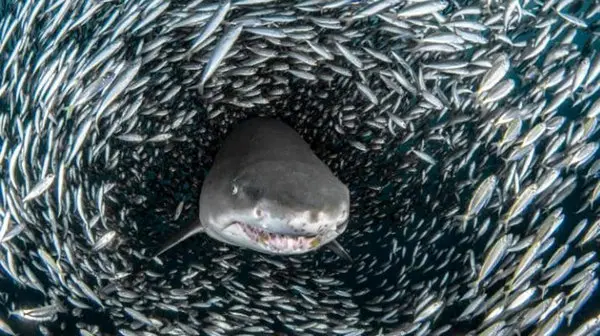 این تصاویر مسحورانه را یک گروه عکاس زیر دریا از کوسه‌هایی که توسط هزاران ماهی در ساحل کارولینای جنوبی در آمریکا محاصره شده‌اند ثبت کرده‌اند.