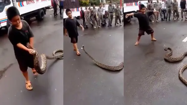 پسر بچه در مقابل چشمان حیرت زده مردم بارها مار را از ناحیه گردن و دم می گیرد و به این طرف و آنطرف می انداز و هیچ نگرانی از حمله این حیوان به خود ندارد.