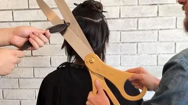 رکنا: این آرایشگر خانم روشی عجیب برای کوتاه کردن موی سر ابداع کرده است؛ او با استفاده از یک قیچی غول پیکر موی مشتریان خود را کوتاه می کند.