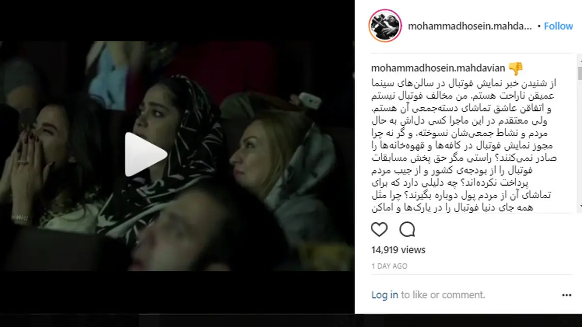 او نوشت: «از شنیدن خبر نمایش فوتبال در سالنهای سینما Cinemaعمیقاً ناراحت هستم. من مخالف فوتبال نیستم و اتفاقاً عاشق تماشای دستهجمعی آن هستم. ولی معتقدم در این ماجرا کسی دلش به حال مردم و نشاط جمعیشان نسوخته. وگر نه چرا مجوز نمایش فوتبال در کافهها و قهوهخانهها را صادر نمیکنند؟ راستی مگر حق پخش مسابقات فوتبال را از بودجه کشور و از جیب مردم پرداخت نکردهاند؟ چه دلیلی دارد که برای تماشای آن از مردم پول دوباره بگیرند؟ چرا مثل همه جای دنیا فوتبال را در پارکها و اماکن عمومی، روی تلویزیونهای شهری یا پردههای بزرگ به طور رایگان برای مردم نمایش نمیدهند؟