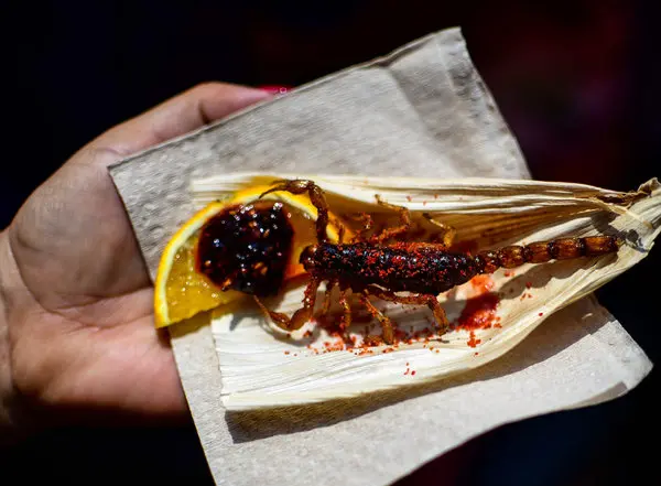 غذاهایی همچون عقرب، جیرجیرک، ساس، اسکامول (لارو و شفیره مورچه)، تخم مورچه و میگوهای کوچک آب شیرین در رستوارنی در مکزیک سرو میشود.