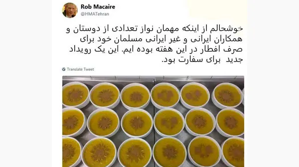 رکنا: راب مک ایر سفیر انگلیس در تهران با انتشار تصویری از شله زردهای دستپخت این سفارت برای روزه داران و افطاری این سفارت به برخی "همکاران" این رویداد را جدید خواند.