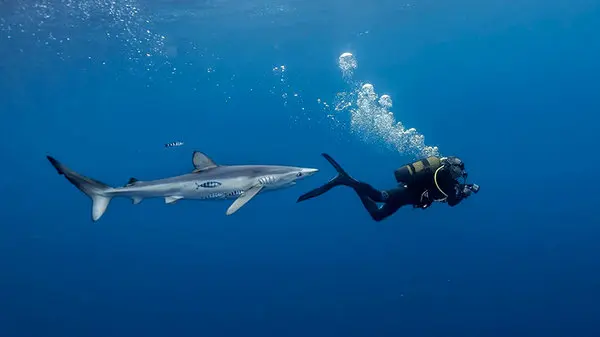 یک کوسه در مجمع الجزایر آزور در نزدیکی لیسبون در حال دنبال کردن غواصی است. کوسه های آبی نر 25 تا 55 کیلو وزن دارند درحالیکه کوسه های ماده تقریبا دو برابر آنها وزن دارند.