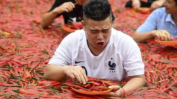یک مرد به نام تنگ شوانهای در یک دقیقه 50 فلفل قرمز گاز زد و خورد ، او با فریاد می گفت خودم را سوزاندم تا پاک شوم.