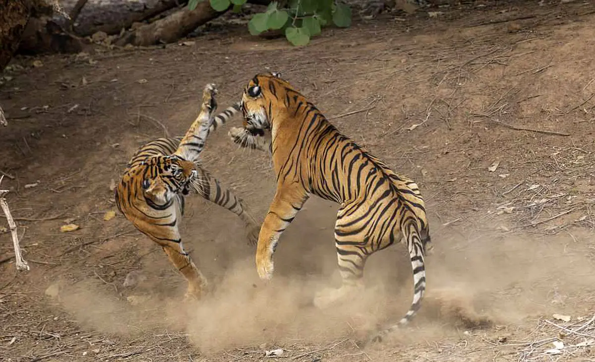 بر اساس گفته عکاسان، در پایان این جنگ عجیب، ببر نر پیروز شده و توانست از قلمرو خود دفاع کند. گفتنی است این اتفاق در پارک جنگلی Rajasthan واقع در هند رخ داده است. تصاویر درگیری بین این دو ببر بسیار داغ شده است تا حدی که به مهم ترین خبر حیات وحش 24 ساعت گذشته تبدیل شده است. در ادامه تصاویری جنگ دو ببر نر و ماده در پارک جنگلی هند را مشاهده میکنید: