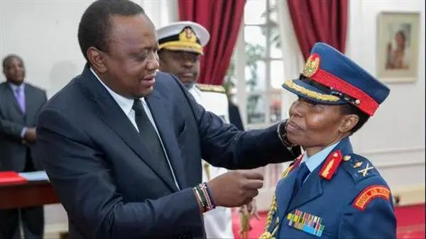 رئیس جمهوری کنیا گفت: اجازه دهید اعلام کنم که این مایه افتخار و مباهات من است که شاهد این باشم که برای نخستین بار در تاریخ کنیا یک زن کنیایی سرلشکر ارتش شود.