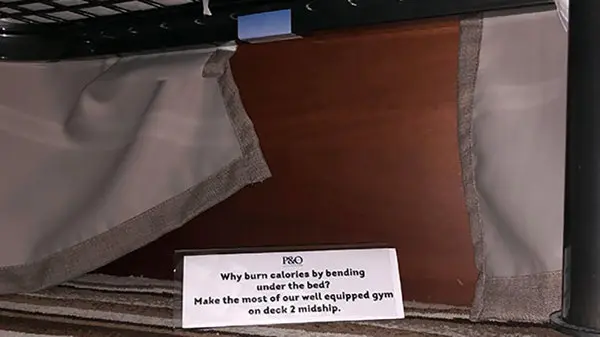 رکنا: عکس زیر تبلیغ عجیب یک باشگاه بدنسازی در یک کشتی را نشان میدهد. در این تبلیغ که زیر تختخواب قرار گرفته آمده است: «چرا برای کالری سوزاندن خم میشوید؟ از امکانات سالن ورزش مجهز ما واقع در عرشه ۲ وسط کشتی بیشترین بهره را بگیرید!»