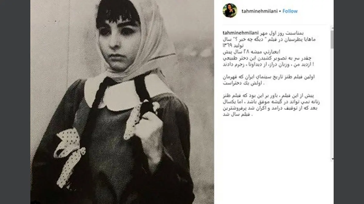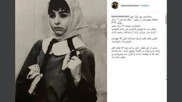 به گزارش رکنا، تهمینه میلانی به مناسبت فرا رسیدن روز اول مهر و بازگشایی مدارس، تصویری از فیلم قدیمی خود با عنوان «دیگه چه خبر» را در اینستاگرام Instagram منتشر کرد و نوشت: «بمناسبت روز اول مهر، ماهایا پطرسیان در فیلم «دیگه چه خبر ؟» سال تولید ١٣٦٩
